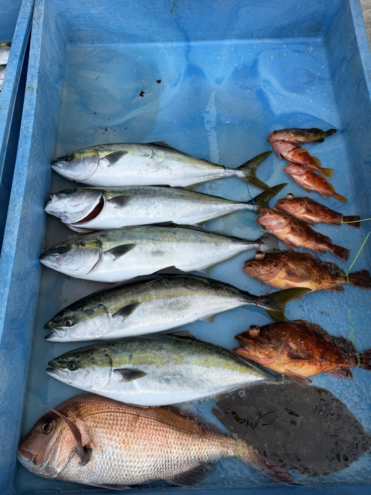 鰤8本、メジロ24本、真鯛1枚、ヒラメ1匹お客さん3人と少人数でしたが青物爆釣でした。そこらじゅう鰤メジロのボイルだらけでキャスティングでボコボコでした。ジギングでも食ってきましたがキャスティングは良くでました。プラグはフローティングのペンシルやシンキングミノーなど。キャスティングのシーズンって感じになってきましたね。