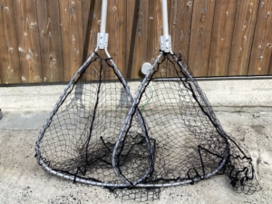 ランディングネットを修理しました 破れているものはネットを替えたり グリップが取れているものは取り付けたり 柄が折……